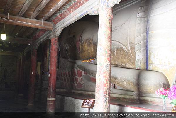 佛身長34.50米,肩寬7.50米,耳朵約4米,脚長5.20米, 堪稱亞洲最大的室内木胎泥塑卧佛像,臥佛是佛陀涅槃的佛身,並不是躺著臥睡,在敦煌石窟也參觀一個臥佛的石窟,身後朔有十大弟子舉哀群像,有面含悲色,有泣淚而立,也有面帶和平喜樂,弟子的個人修道高下可見