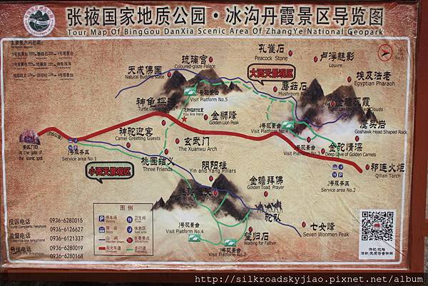 冰沟丹霞景观区,海拔1500-2550米,作为古老的地质遗迹,它发源于侏罗纪至第三纪时期,景区总面积达300平方公里,核心游览区约占120平方公里,我們的包車停在入口處,買了票之後,就搭乘電瓶車進入景區了,電瓶車就是一個景一個景的上下車